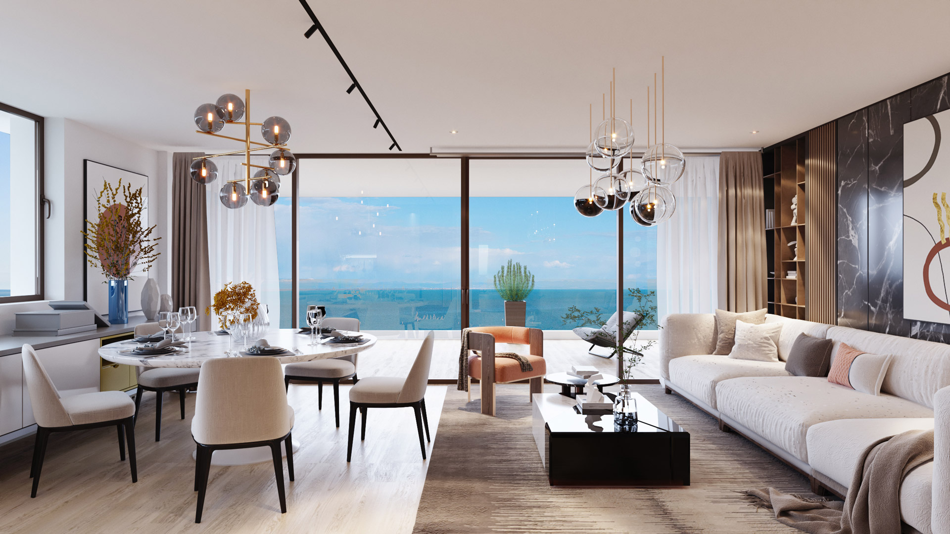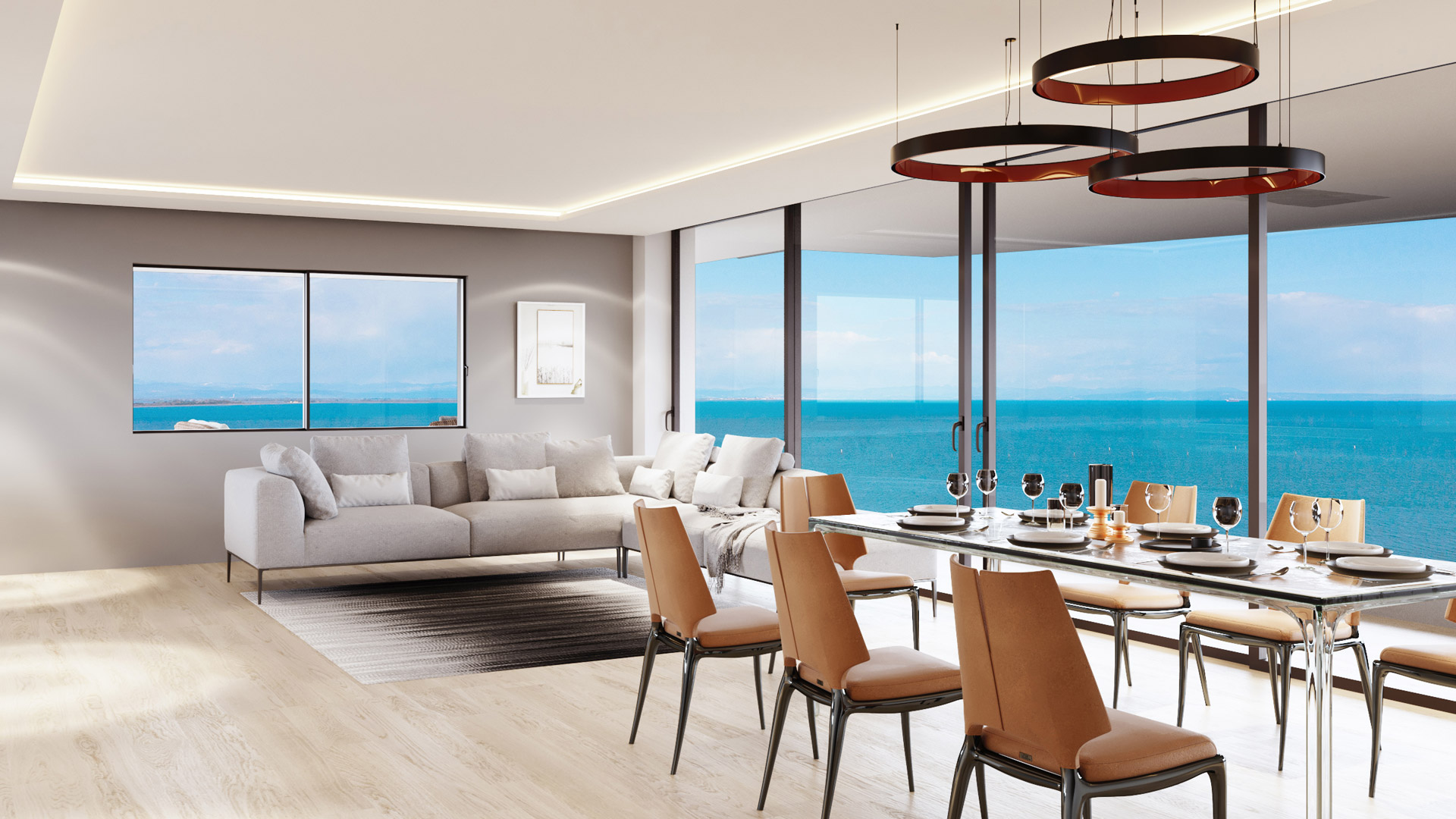 La confortevole zona living, accarezza le raffinate ed ampie terrazze con vista panoramica sul mare e sulla laguna."