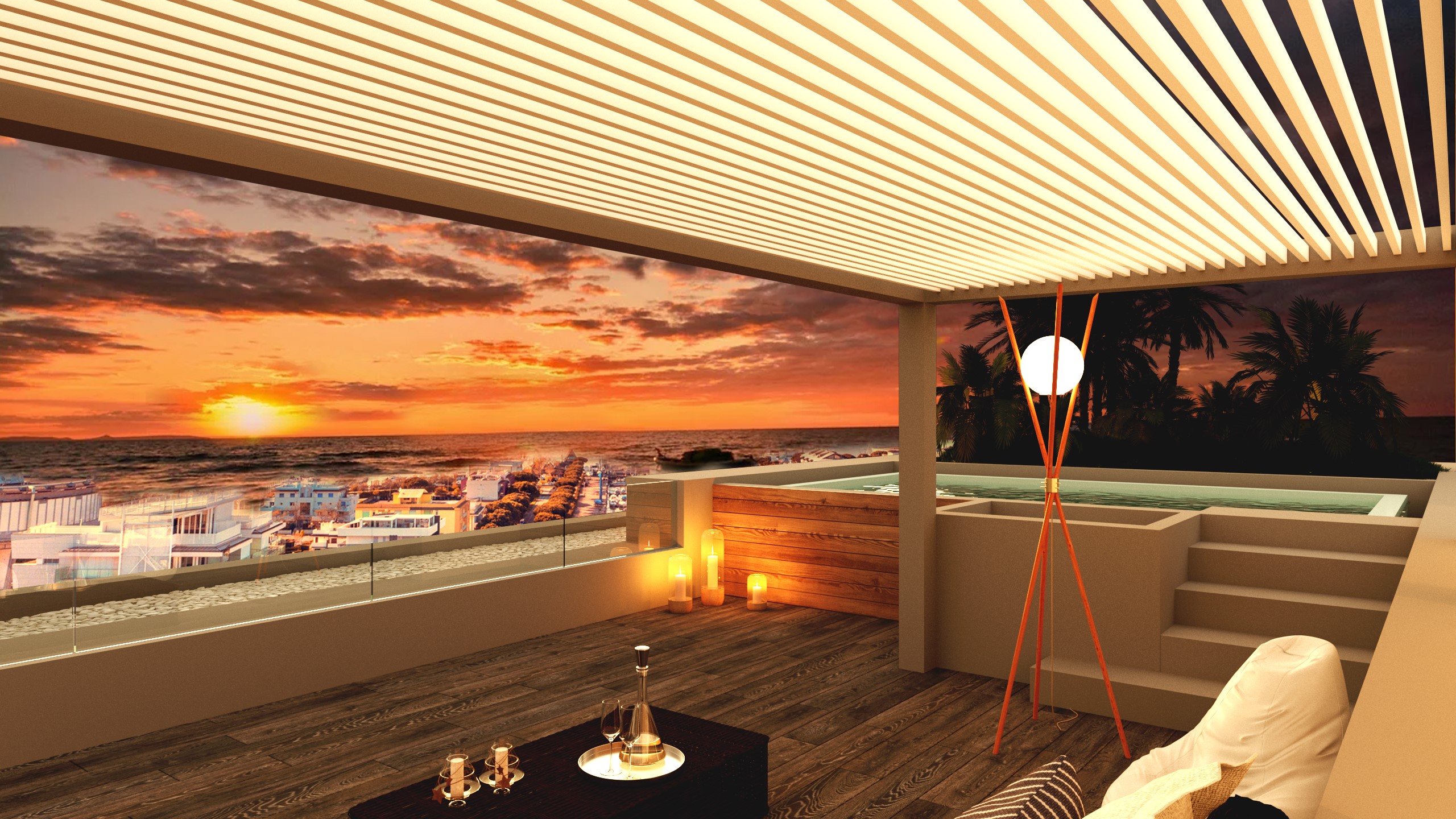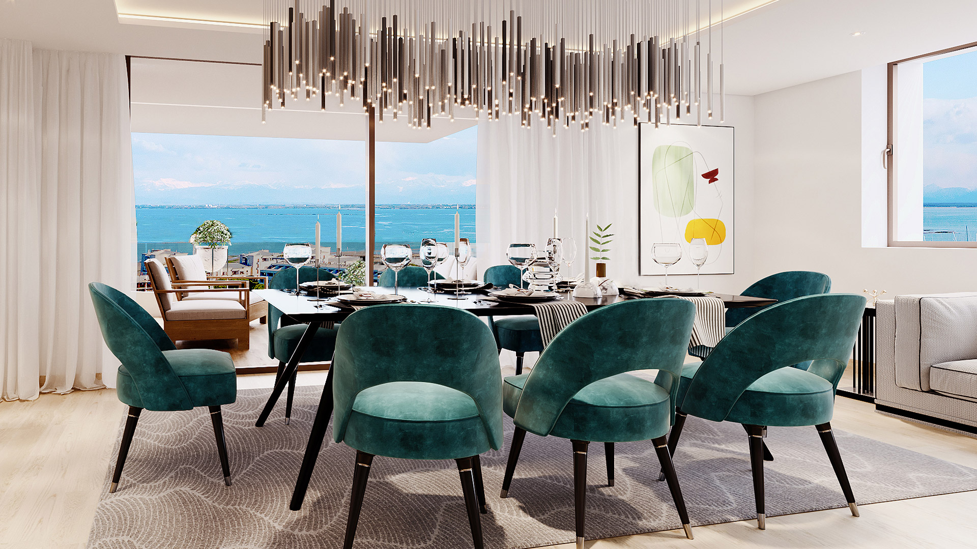 La confortevole zona living, accarezza le raffinate ed ampie terrazze con vista panoramica sul mare e sulla laguna.